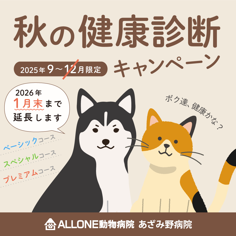 掲載日︓2025.12.17 ★ 1月まで延長:秋の健康診断キャンペーン(~2026/1/31)【あざみ野】 ★実施期間を2026年1月末まで延長いたします★ 9/1(月)から、ALLONE動物病院 あざみ野病院にて「秋の健康診断キャンペーン」を実施します。わんちゃん・ねこちゃんの体調を把握し、健康維持や共同生活の充実を図りましょう。 実施期間:2025年9月1日(月)~12月末まで 2026年1月31日(土)まで ※予約制となりますので、お電話ください。 ※実施期間の後半は混み合いますので、お早めにお申し込みください。 詳しくはスタッフまでお問い合わせください。